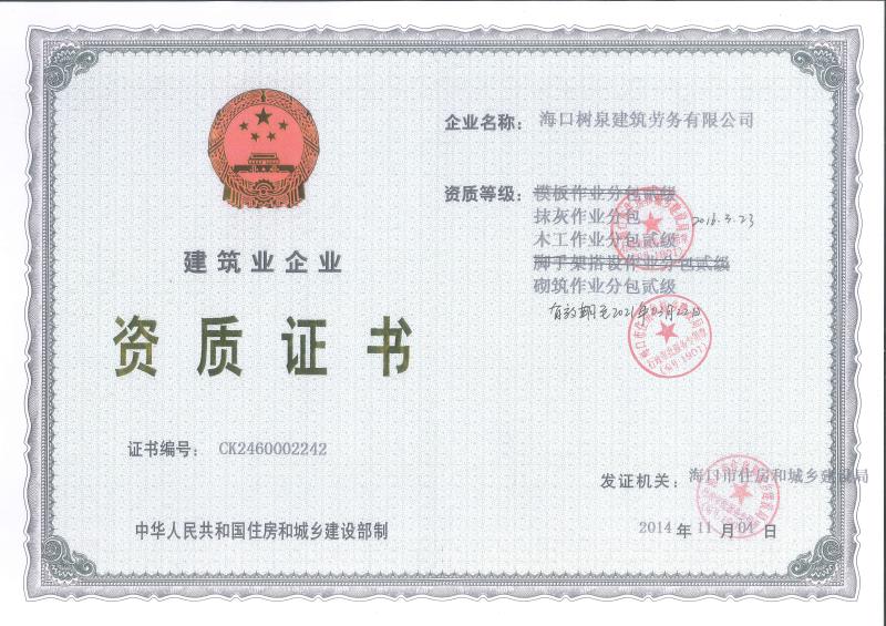 ??跇淙ㄖ趧沼邢薰境闪⒂?011年,公司位于??冢淝吧硎且患覍I建筑施工隊,自2004年即開始在海南從事建筑勞務施工。自成立至今,公司已經擁有一支科學管理、質量過硬、能打硬仗,搶工期的專業隊伍。能獨立承擔大中型工業與民用建筑 、室內外裝修、各類機電設備安裝工程。代表工程有海口濱海華庭、三亞時代海岸T01/02/04/05棟高層、合肥東海花園二期、陵水富力灣B區高層、三亞金中海(酒店)、瓊海大印經典花園、??诃h球海景大酒店(四星級酒店,在建中)、陵水珍珠大廈(五星酒店)、海口萬達廣場、美蘭機場二期。